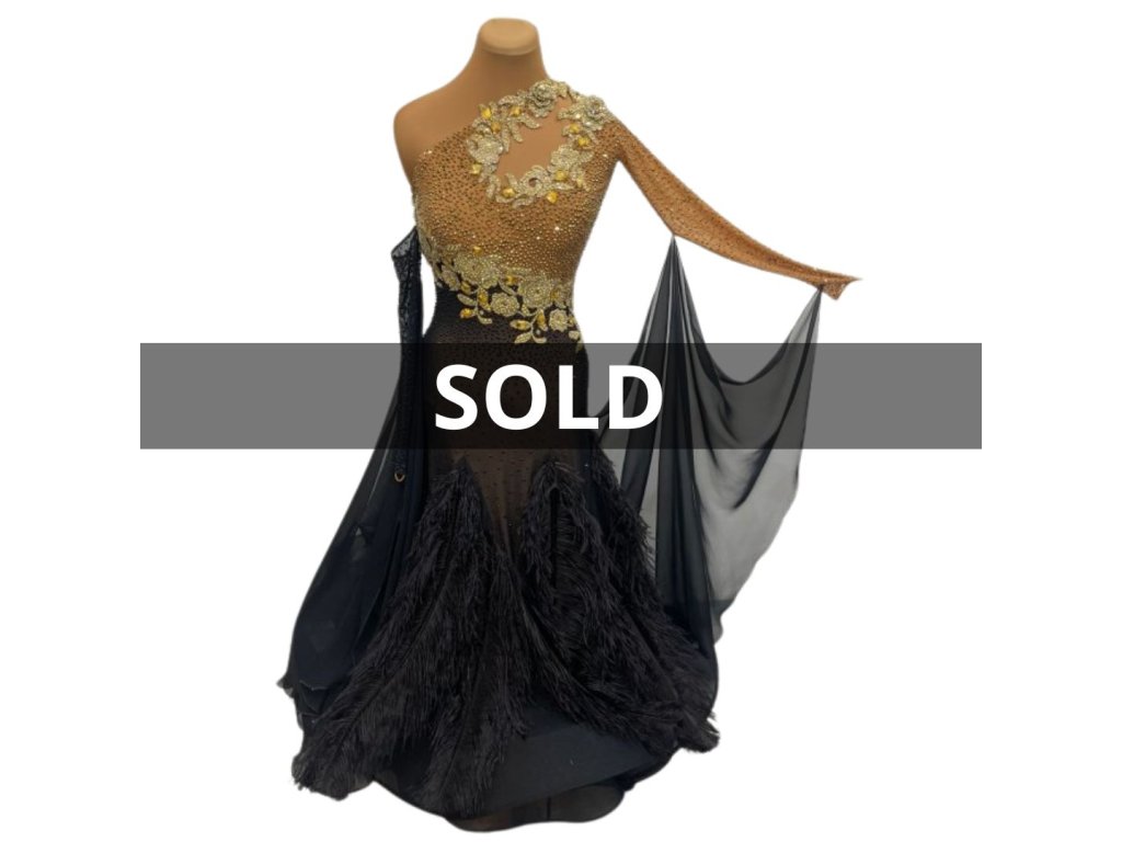 Black ballroom dress with gold details richly decorated with gold lace and rhinestones