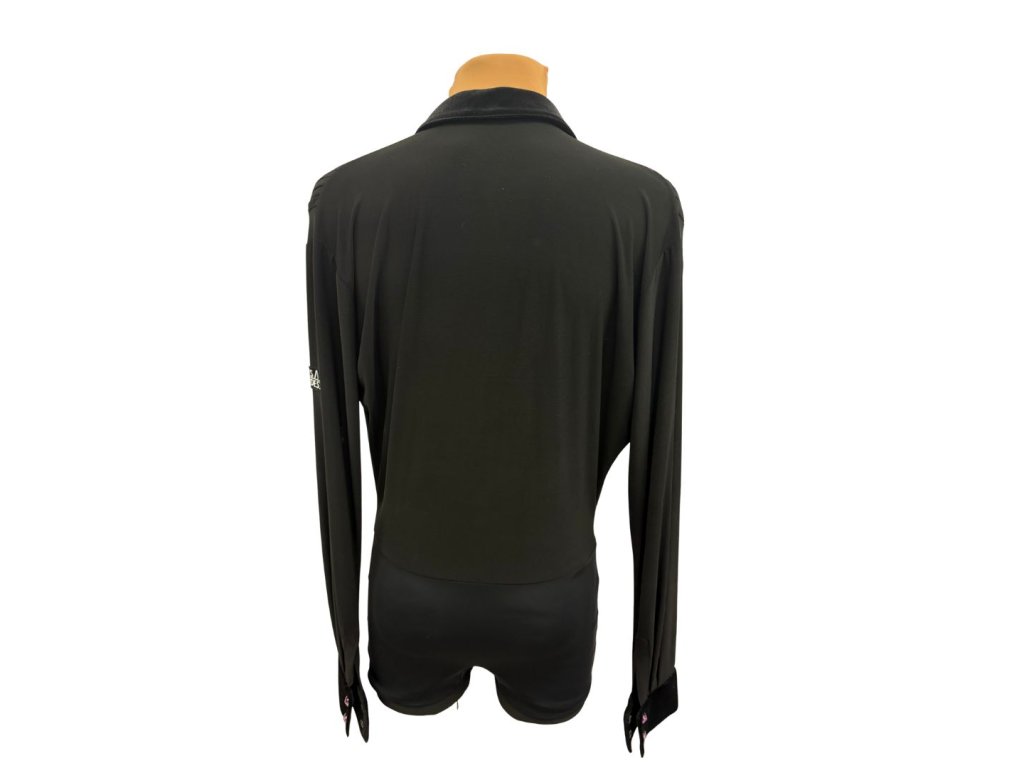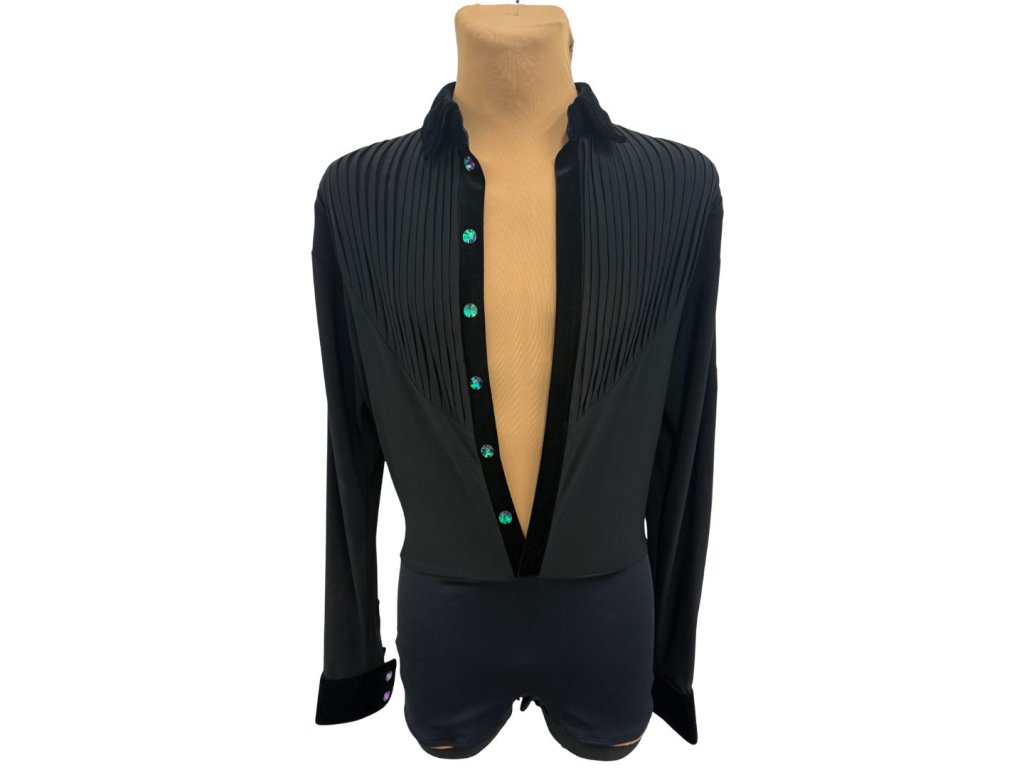 Black latin shirt with emerald buttons on body and sleeves.