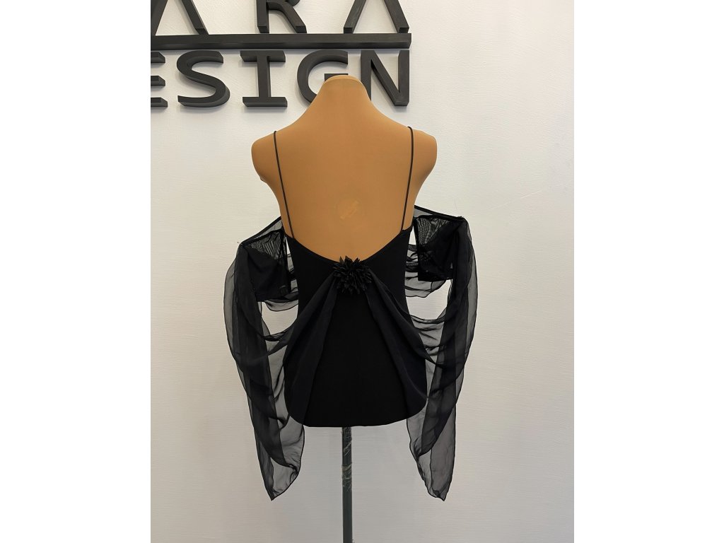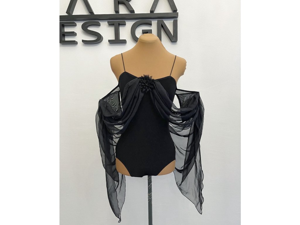 Embrace elegance with every movement. This stunning black leotard features delicate draped chiffon sleeves and a floral centerpiece, perfect for dancers who seek both grace and style.