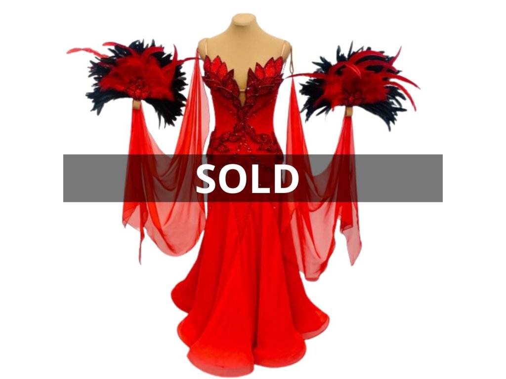 Red ballroom dress richly decorated with rhinestones and feather bracelets